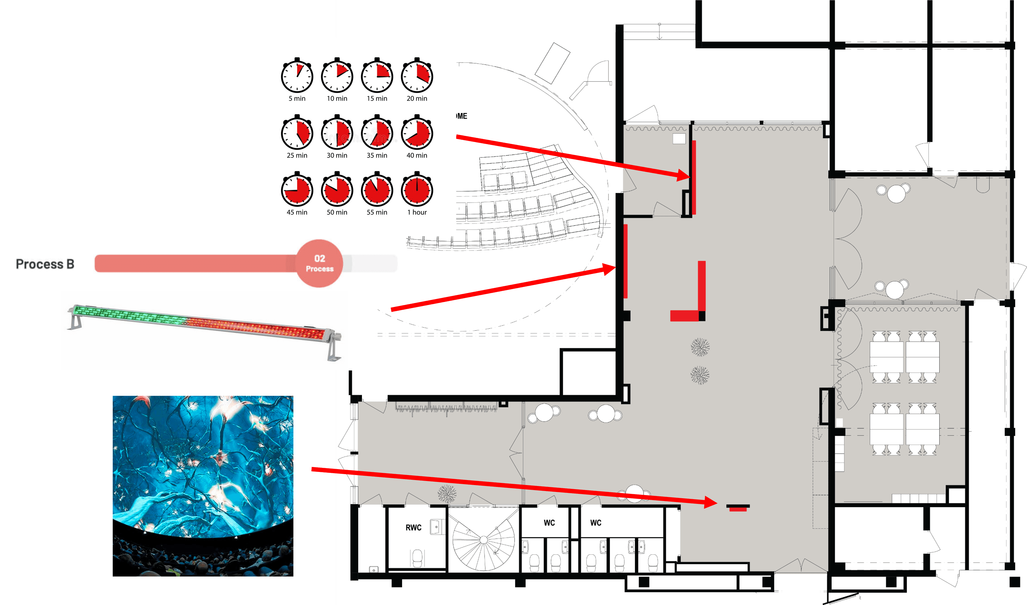 The goal of the project is to optimize visitor flow in and out of the Wisdome, while creating an engaging waiting experience. Through spatial planning and interactive displays, the foyer should create a journey that begins the moment the visitors arrive.