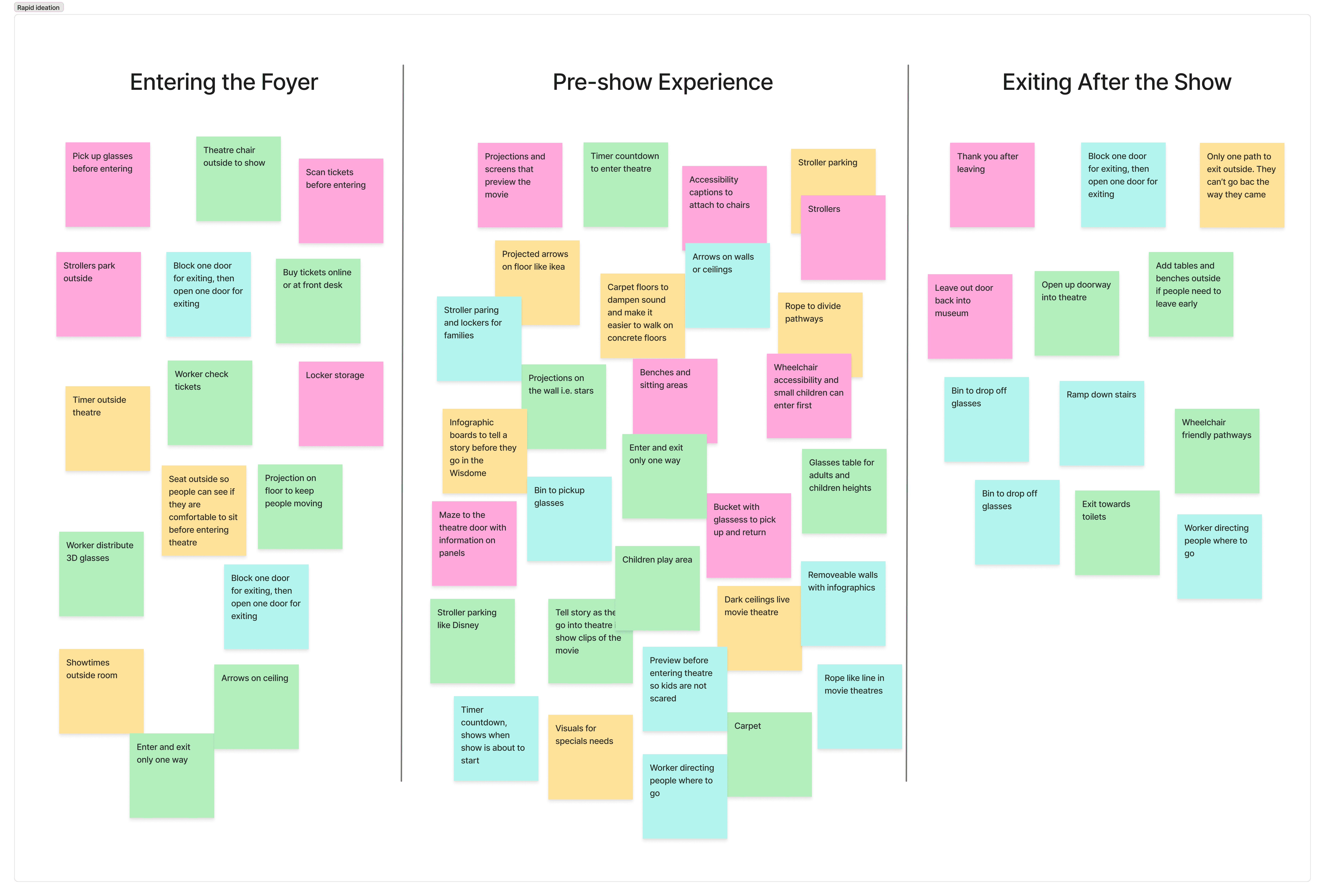 A rapid brainstorming session was held to come up with solutions for the identified problems. The ideas were grouped into three categories: entering the foyer, pre-show experience, and exiting after the show. This framework helped us pinpoint solutions for each phase of the visitor journey.
