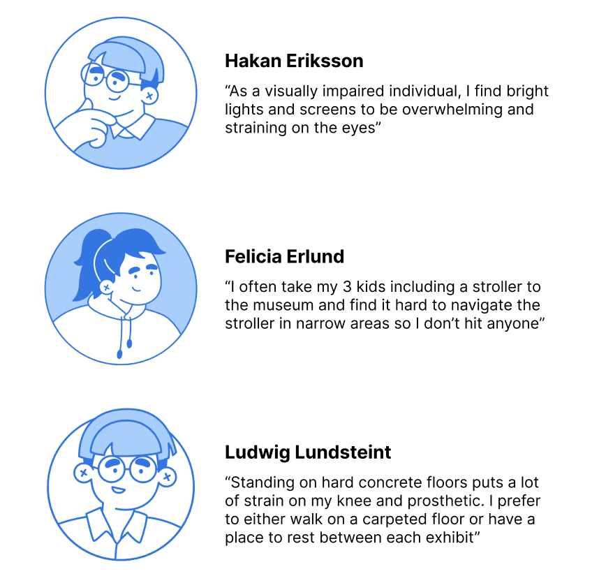 We conducted user interviews with museum visitors that represented a range of accessibility needs, mobility levels, and family situations. From these conversations, I developed personas that helped to inform our design decisions, ensuring we addressed real concerns rather than assumptions.